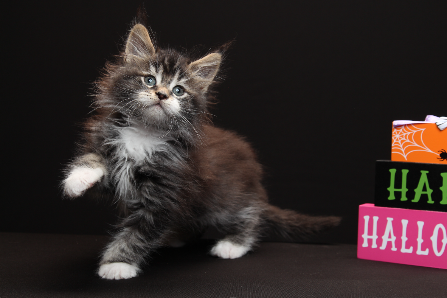 Hannibal is an adorable Maine Coon kitten who wins hearts with his charming personality and striking looks. His coat is a stunning mix of rich brown and pristine white, displaying the classic markings typical of this beloved breed. With his playful spirit and affectionate nature, Hannibal is more than just a pet; he’s a delightful companion who brings joy and warmth to any home.