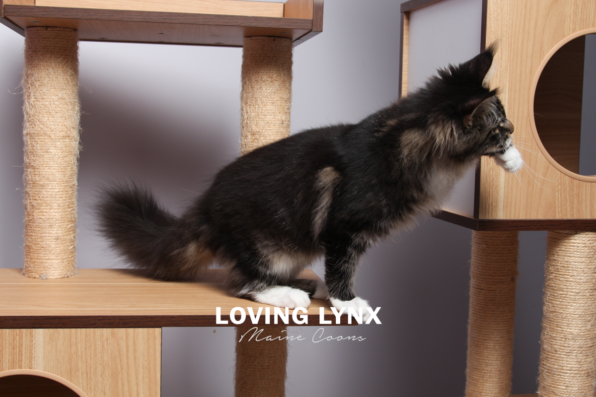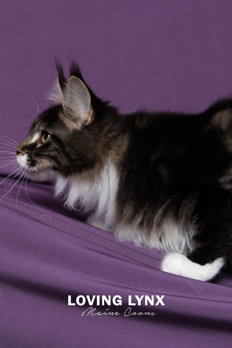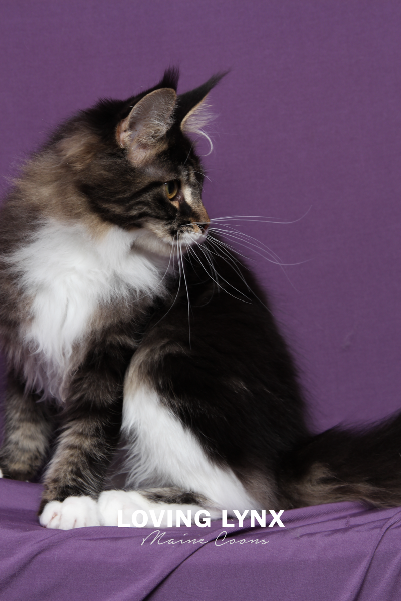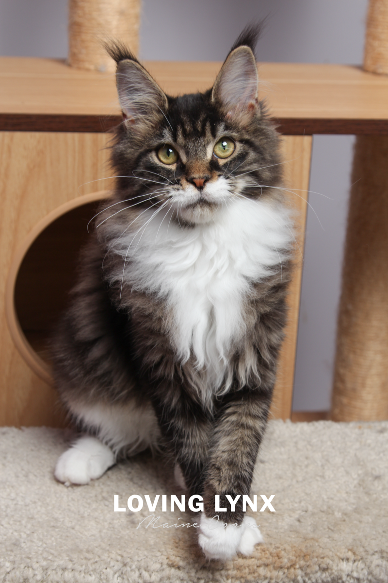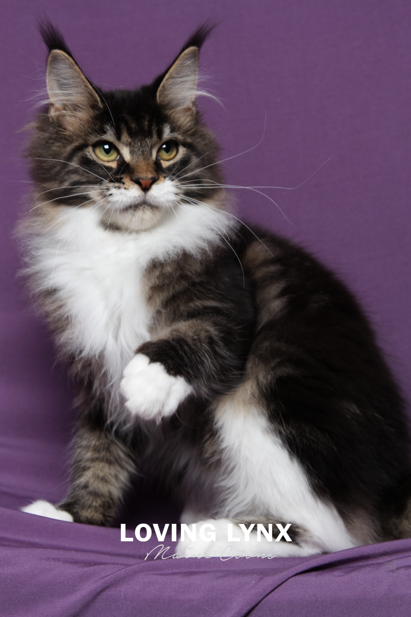 Meet Bella, a Maine Coon kitten who steals hearts with her beautiful brown and white classic coat. This little sweetheart is more than just a pretty face; her gentle and loving nature makes her an ideal companion. With a personality as sweet as her looks, Bella truly represents the essence of a cuddly doll baby, eager to bring joy and warmth to any home. Don't miss the chance to welcome this charming furball into your life and enjoy the love and happiness she brings.