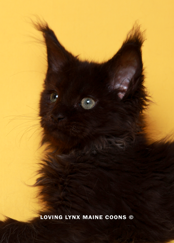 Black Knight is a solid black Maine Coon Kitten. I thought was a girl but surprise… it’s a boy! He’s a sweet gentle guy. He is the runt of the litter but is now same size as the others.