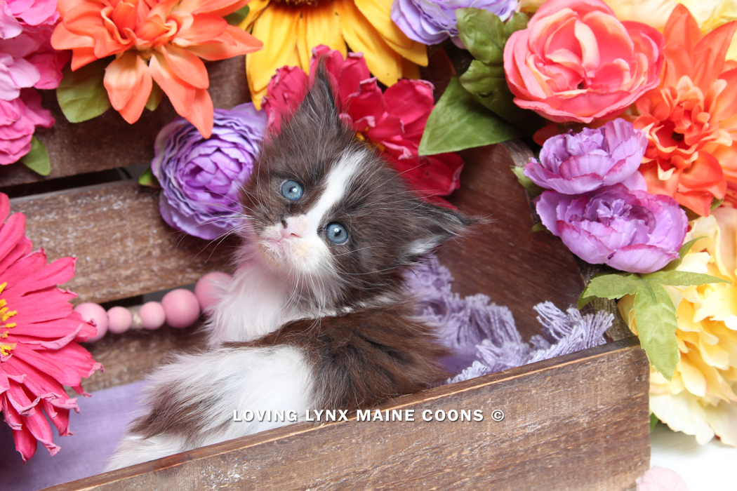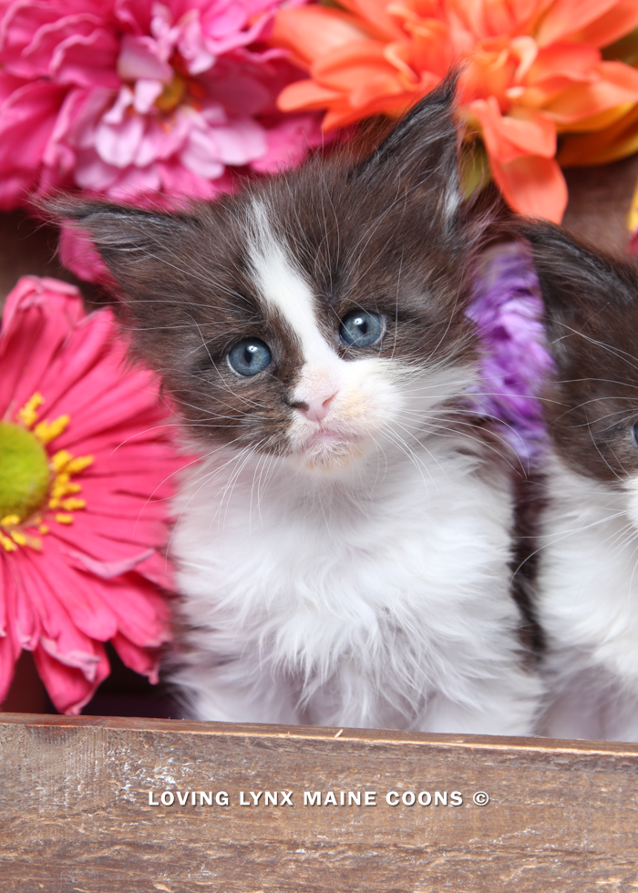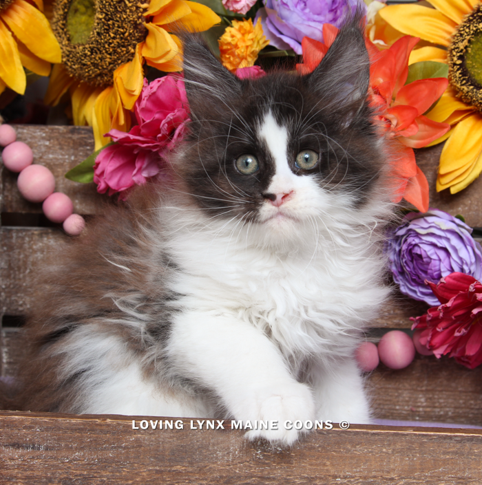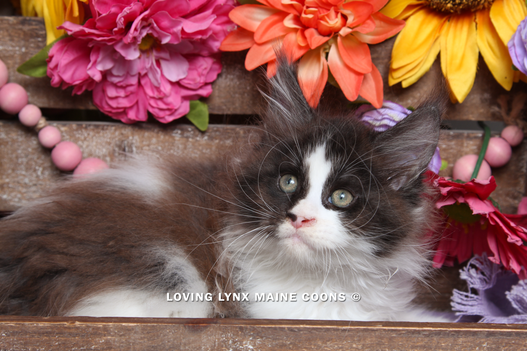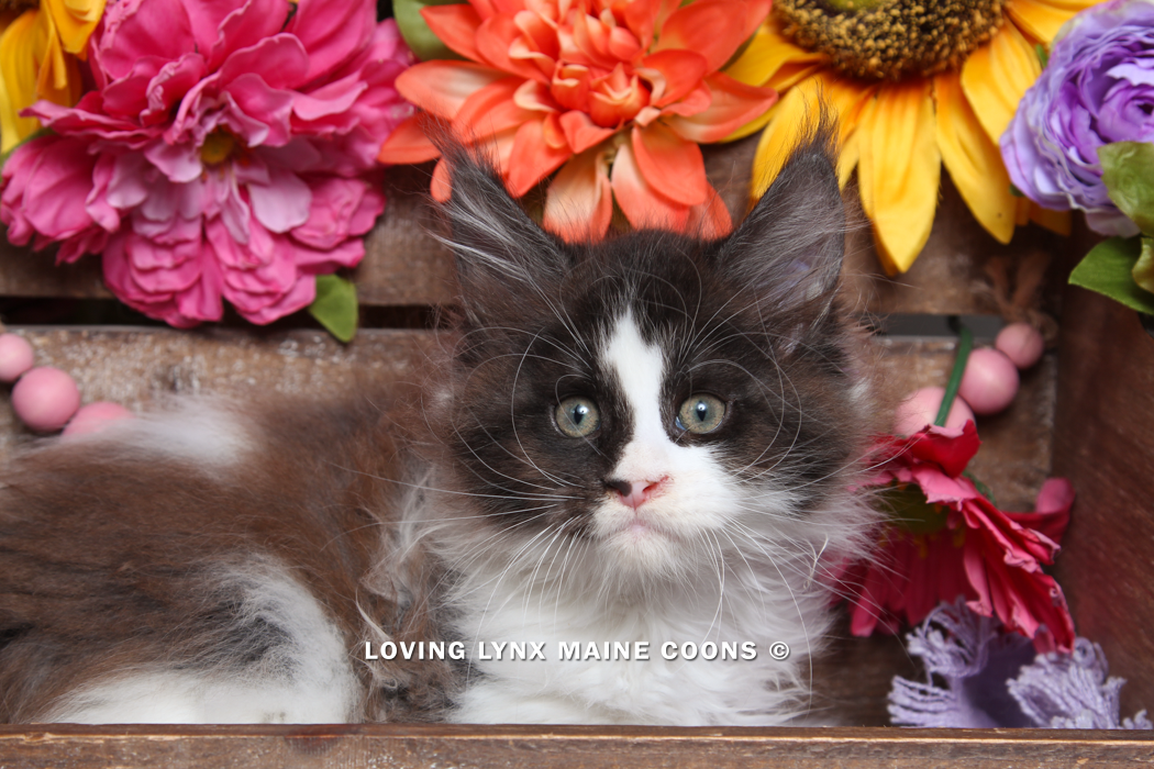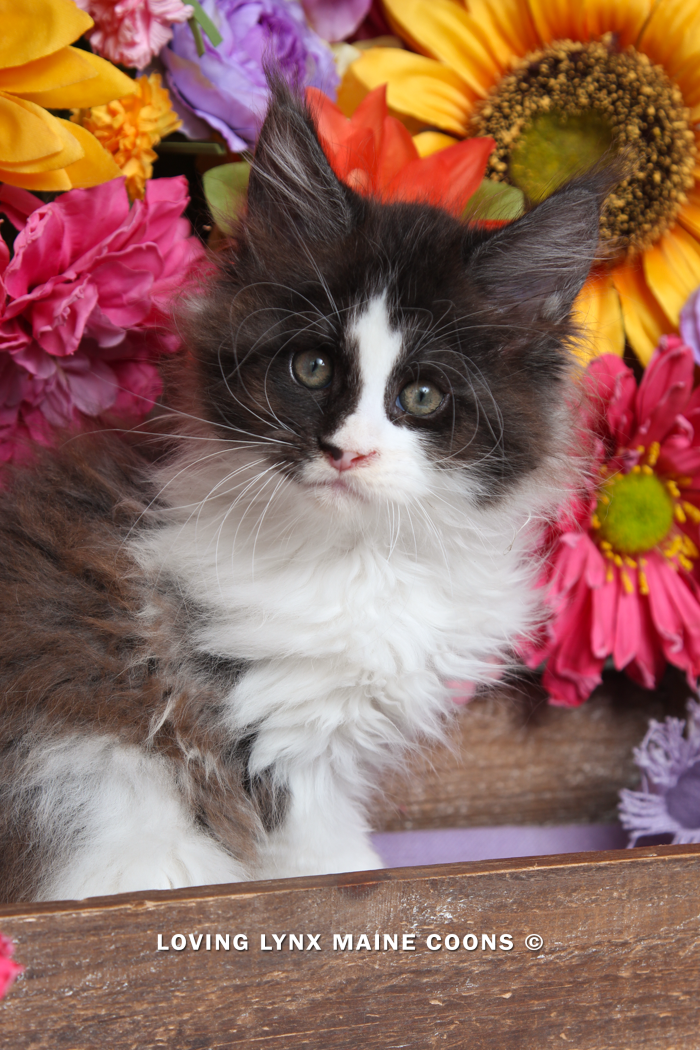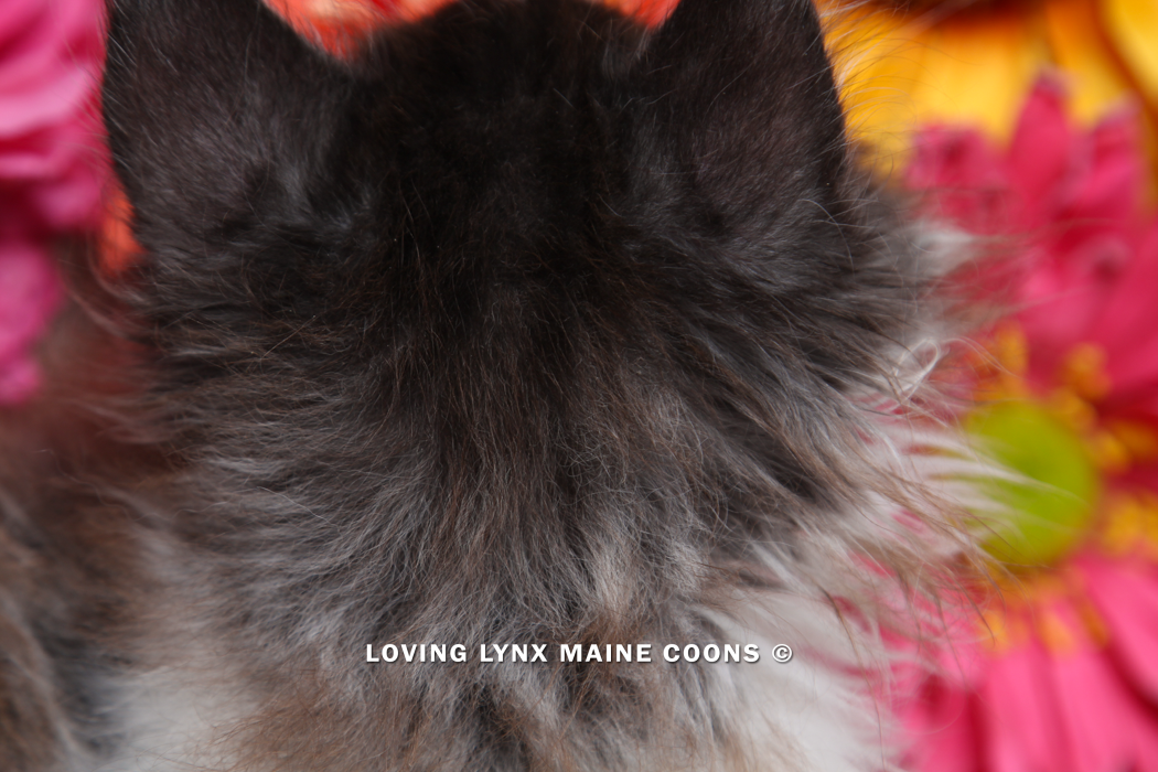 Meet Cow, a smoke with high white male Maine Coon Kitten. He was born July/28/2025, ready to leave around October 13th. STUNNING smoke with high white male! Crystal’s litter has long been awaited and does not disappoint!!! Both boys are premium quality kittens!