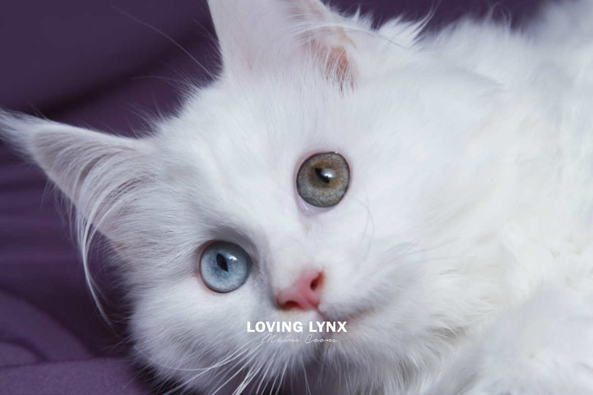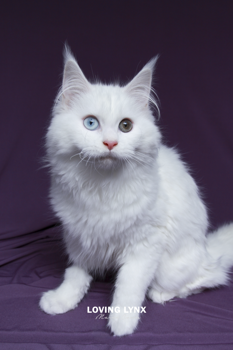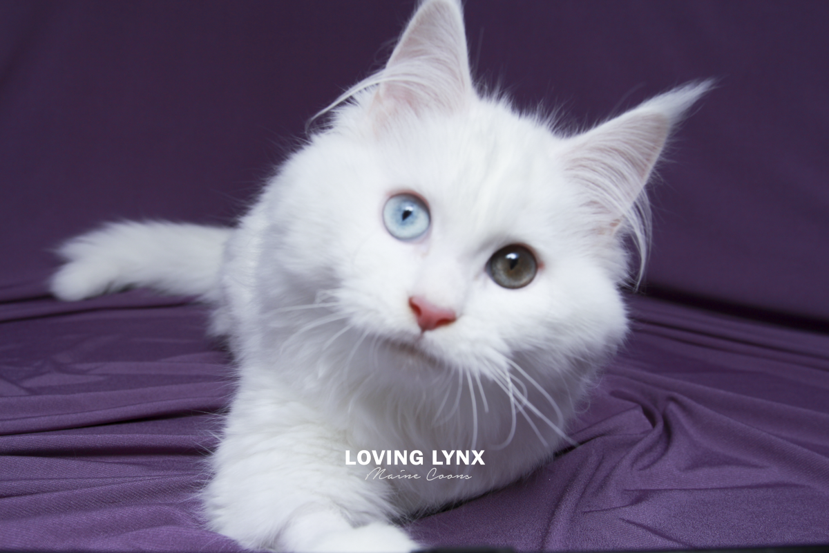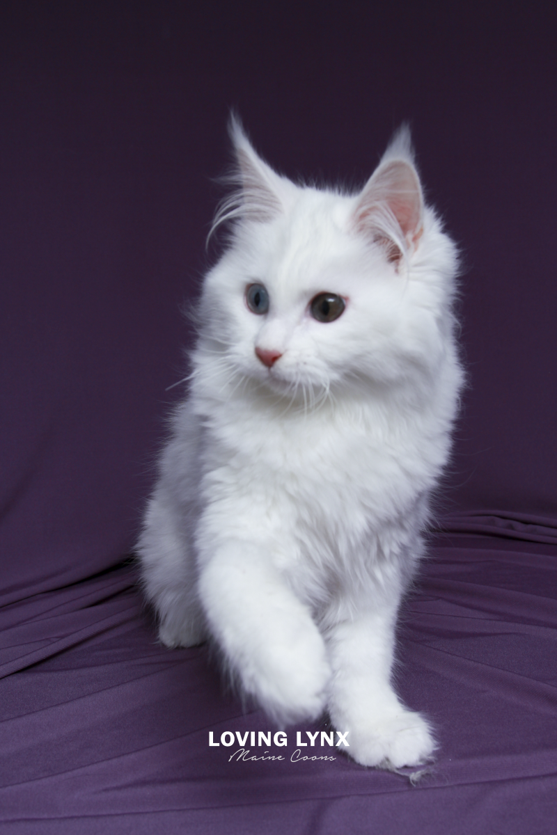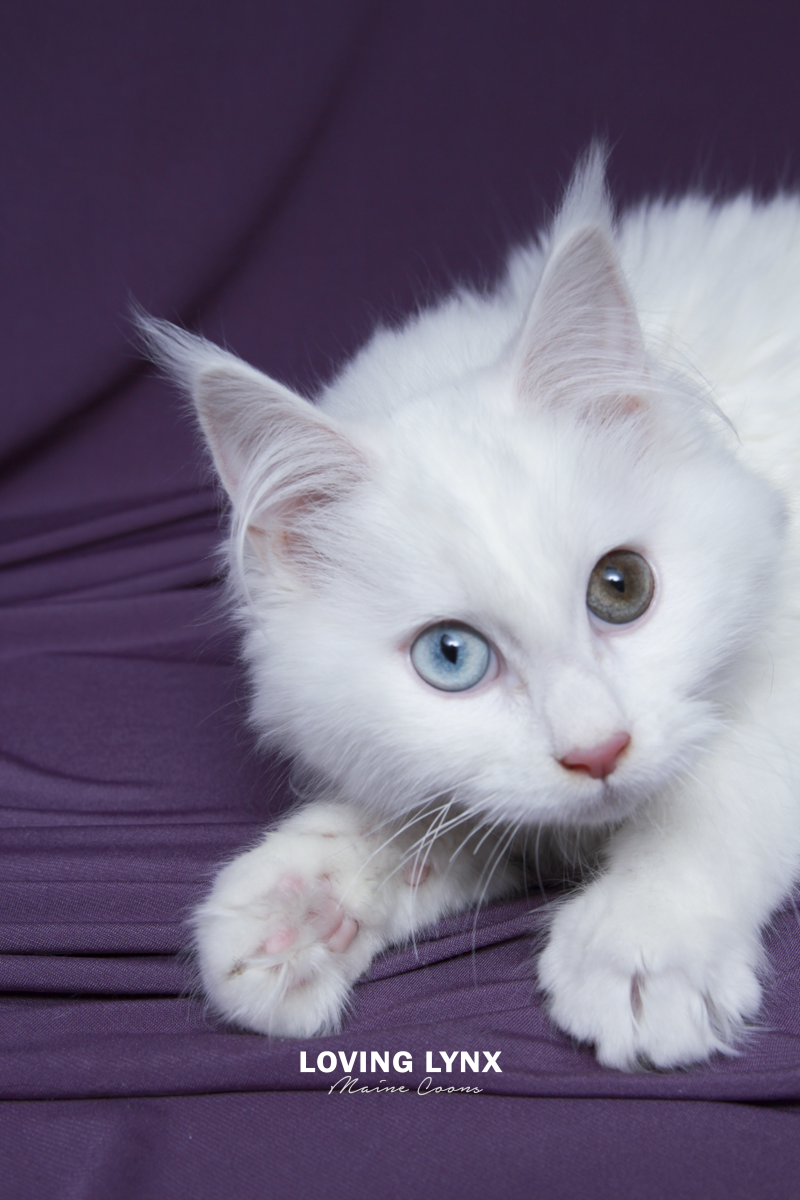 Daisy is a highly prized odd eye and solid white Maine Coon Kitten. Fur is bunny soft! I can not express how loving this baby girl is and how much love she will give to you. The entire litter has bomb proof temperaments! Her mother throws the most amazing temermants that are easy going, smart and very family friendly! This girl is absolutely drop dead gorgeous and practically jumps into your hands. She adores attention. Very loving. She would fit into any home.