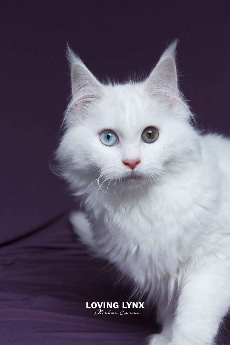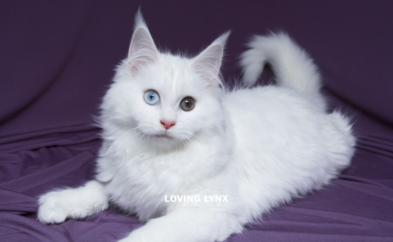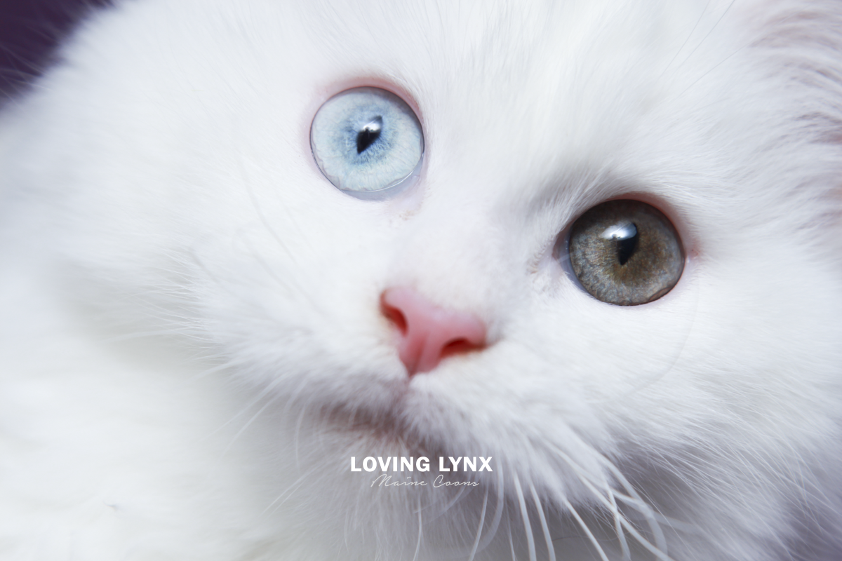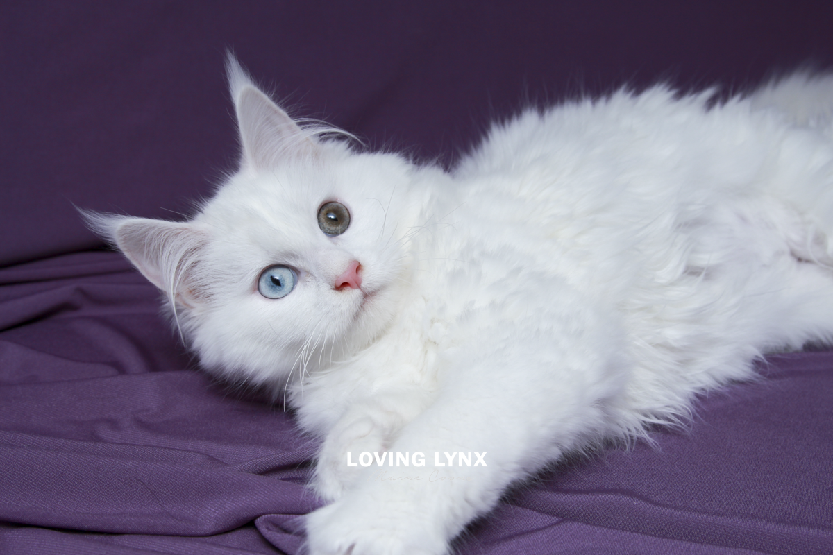 Daisy is a highly prized odd eye and solid white Maine Coon Kitten. Fur is bunny soft! I can not express how loving this baby girl is and how much love she will give to you. The entire litter has bomb proof temperaments! Her mother throws the most amazing temermants that are easy going, smart and very family friendly! This girl is absolutely drop dead gorgeous and practically jumps into your hands. She adores attention. Very loving. She would fit into any home.